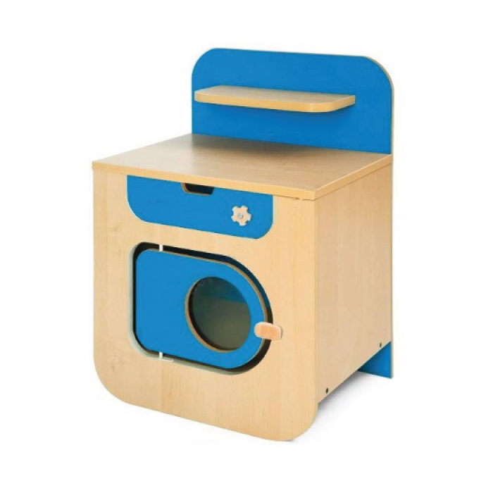 Perilica rublja za malu djecu interaktivno je igralište koje omogućuje djeci da se urone u svakodnevne kućanske poslove. Ova samostojeća jedinica dizajnirana je imajući na umu udobnost i sigurnost najmlađih korisnika. Okvir je izrađen od iverice u boji breze debljine 18 mm, dok plavi detalji od MDF-a debljine 12 mm daju perilici rublja ugodan, dječji izgled. Glatka površina olakšava čišćenje, a unutrašnjost perilice rublja ima praktičnu policu, savršenu za pohranu pribora za igračke. Dekorativni MDF elementi dodaju karakter i privlačnost.